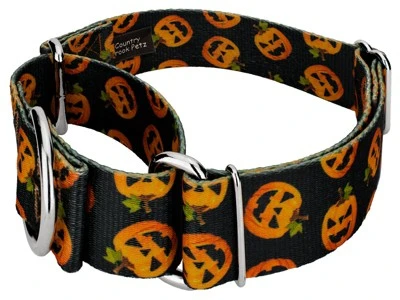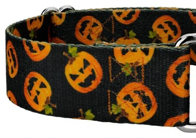 Is your escape artist slipping out of their collar? Martingale collars are designed to prevent your pup from pulling out of their collar by tightening around your dog’s neck whenever they try to remove their heads. Once your dog quits pulling, the collar relaxes again. Perfect for training, the twin-loop design gives you control over your stroll. The martingale collar is often referred to as a humane choke collar because it naturally limits how much it tightens, ensuring your dog’s safety. A no-slip, adjustable, limited choke collar is an excellent solution for sighthounds who slip out of their collars.Trick or Treat yourself with Country Brook Petz Happy Jack 1 1/2 Inch Martingale Dog Collar! This haunting design is filled with happy jack-o-lanterns on a deep black background; bright spooky orange pumpkins with a face of Halloween joy. Printed using state-of-the-art colorfast inks, our collars will not run or bleed. Crafted from industry-leading hardware and webbing, Country Brook Petz’ 1 1/2 Inch Happy Jack Martingale Dog Collars stand up under tough conditions, all while keeping your furry friend looking fab.By adjusting the metal slide, you give slack to the loop. Slip it over your dog’s neck and decrease size until you can comfortably slip only two fingers under the collar. The unique limited closure prevents the choke from becoming too tight. We at Country Brook Petz pride ourselves on only using the best hardware, and you can rest assured that these collars will withstand whatever your pup gets into. Our collars have wide-mouthed heavy-duty triglides for easy adjustment and heavy-welded D-rings for strength.