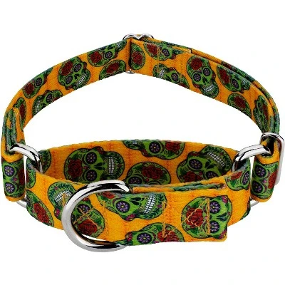 Enjoy the bright, vivid colors of Country Brook Petz Sugar Skulls Martingale Dog Collar! This calavera print boasts meticulously detailed skulls with beautiful flower accents on a rich orange-toned background. Printed using our colorfast dye, our collars will not run or bleed. Created from superior hardware and webbing, Country Brook Petz’ Sugar Skulls Martingale Dog Collars will not only provide your pup with a trendy collar, but will give you a sense of ease when using our products. Is your good boy or girl slipping out of their collar? Well, our martingale collars are designed to prevent your pup from pulling out of their collar by tightening around your dog’s neck whenever they try to remove their heads. Once Fido quits pulling, the collar relaxes against their neck. Perfect for training, the twin loop design gives you control over your stroll. The martingale collar is often referred to as a humane choke collar. A no-slip, adjustable-choke collar is an excellent solution for sighthounds who slip out of their collars.The Extra Small, Mini and Micro are still reliable with a 700 lb. tensile strength, even though they may seem delicate.By adjusting the metal slide, you give slack to the loop. Slip it over your dog’s neck and decrease size until you can comfortably slip only a couple of fingers under the collar. The unique limited closure prevents the choke from becoming too tight. We at Country Brook Petz pride ourselves on only using the best hardware and you can rest assured that these collars will withstand whatever your pup brings its way. Our collars have wide-mouthed heavy-duty triglides for easy adjustment and heavy-welded D-rings for strength. Designed to give you back control while your pup is leashed.