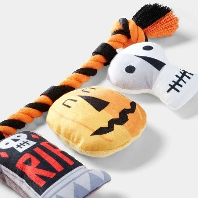 This Halloween Plush Icons Dog Toy from Hyde & EEK! Boutiqueâ„¢ lets your furry friend get in on the seasonal fun. This rope dog toy features Halloween-themed icons including a pumpkin, tombstone and skull for festive, spooky appeal. Designed to crinkle and squeak, it’s sure to excite your dog and is great for playing tug-of-war.