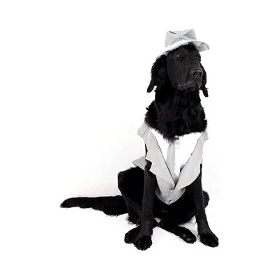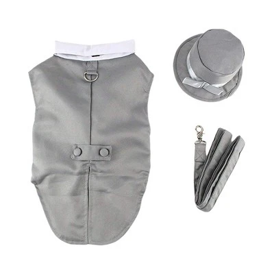 This grey pet tuxedo features the suit, top hat, and leash for a complete outfit. The tuxedo is lined, has a pocket square in the chest pocket, and has a formal tail design. The tie is removable so you can swap it out to match the wedding colors. Hook and loop closure on the chest keeps this vest securely on your pet. It includes a D-ring you can use to attach the leash. Available in 7 sizes.Â
