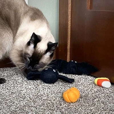 Your pet can celebrate Halloween this year! Not with candy or catnip, but with felt toys! Felted wool Halloween Felt Cat Toys Set includes 1 each of a bat, a spider, a pumpkin, and a piece of candy corn. These small toys are perfect to stuff inside your cat’s Halloween treat bucket! Spoil your kitty this Halloween with the Midlee Halloween Felt Cat Toys Set!
