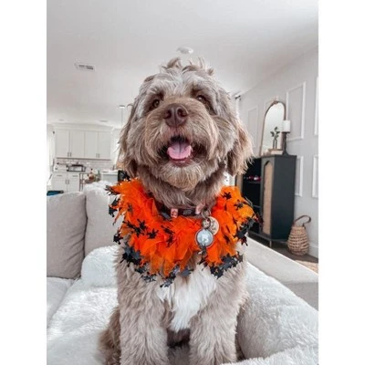 Have no fear, when your dog is wearing this witch collar, it will be the nice witch, not the mean witch! Bright orange tulle with black witch decals. Stretchy so easy to put on and take off your dog. This Halloween pet collar is a great alternative to a dog costume. Not to be used as a restraint.