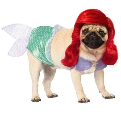 Your little mermaid will be ready for an adventure under the sea in this adorable, officially licensed Disney Ariel Pet Costume. Ariel dreamed of being where the people are, and that will be easy for your pet in this costume, which includes a green mermaid tail with white fins, purple shell bra with yellow starfish accent, and luscious red wig.
